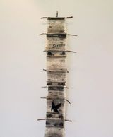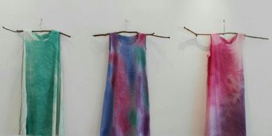 The dresses are made of calico and are handpainted. The centre dress has writing stitched onto it with freemotion machine embroidery. During the exhibition these dresses will be transformed in artists workshops. Objects, shapes, etc., will be made using needle felting, freemotion machine embroidery, applique and stitched to them to recreate there appearance.