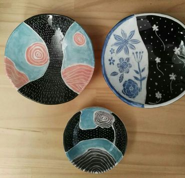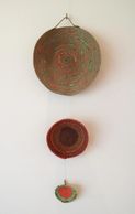 These pots are made from Cotton rope coiled, shaped and stitched together. Some are natural colours and others are decorated with applique and stitching.