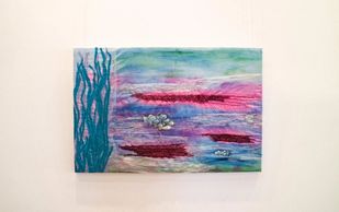 Handpainted calico with freemotion machine embroidery, cotton appliqued in layers with Tulle and organza added for effect.